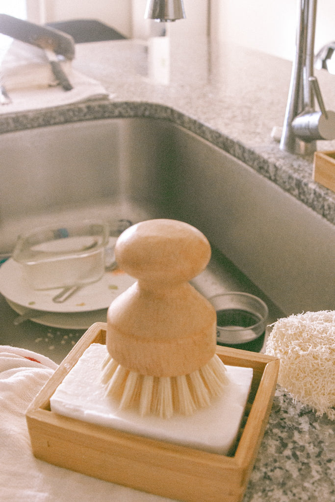 The Moso Bamboo Soap Shelf, a perfect dry resting spot for the dishwashing soap.