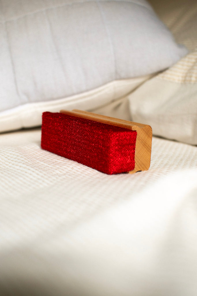Our fuzz remover is made from beechwood, stainless steel, and polyester velvet.